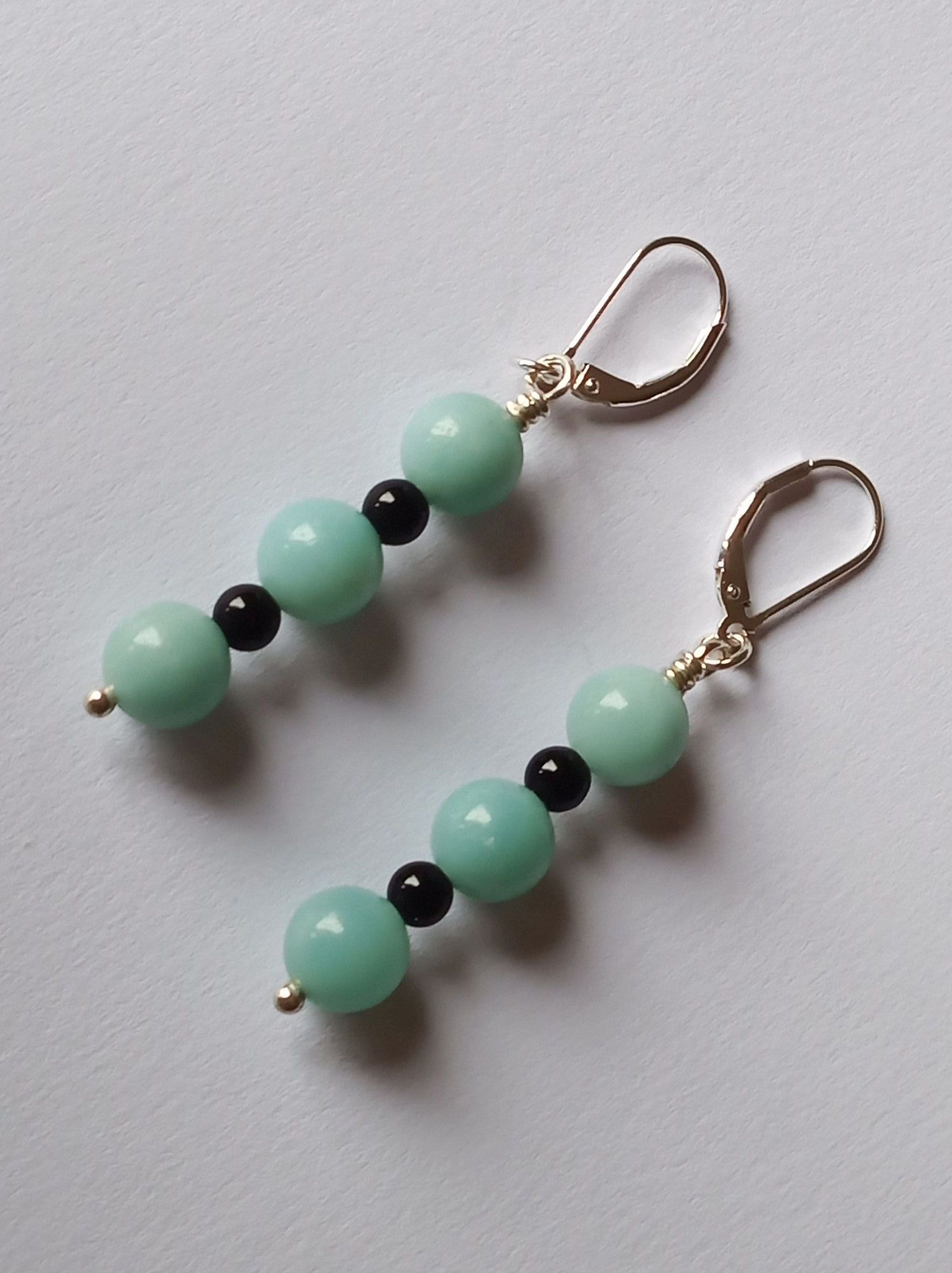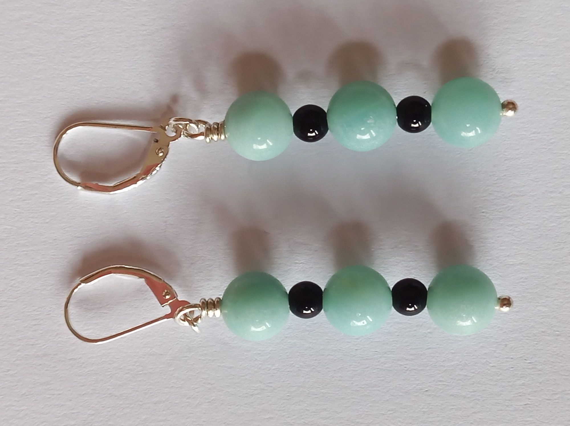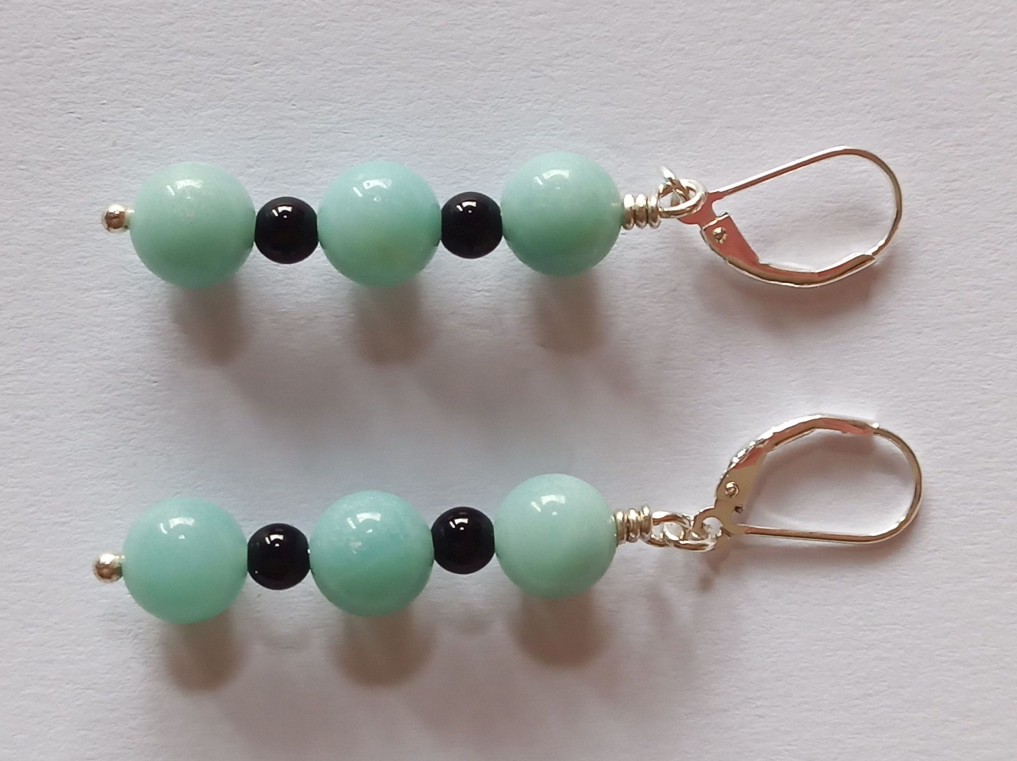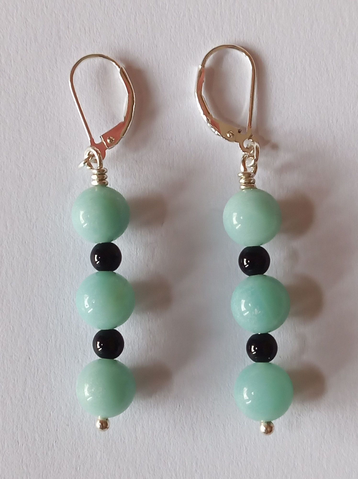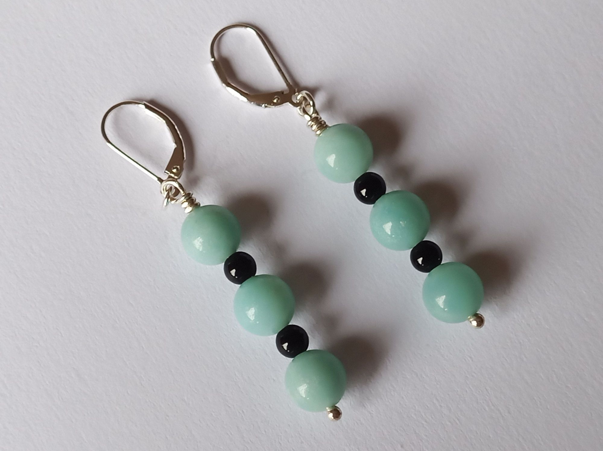 Für diese Hängeohrringe wurden Amazonit- und Onyx-Perlen