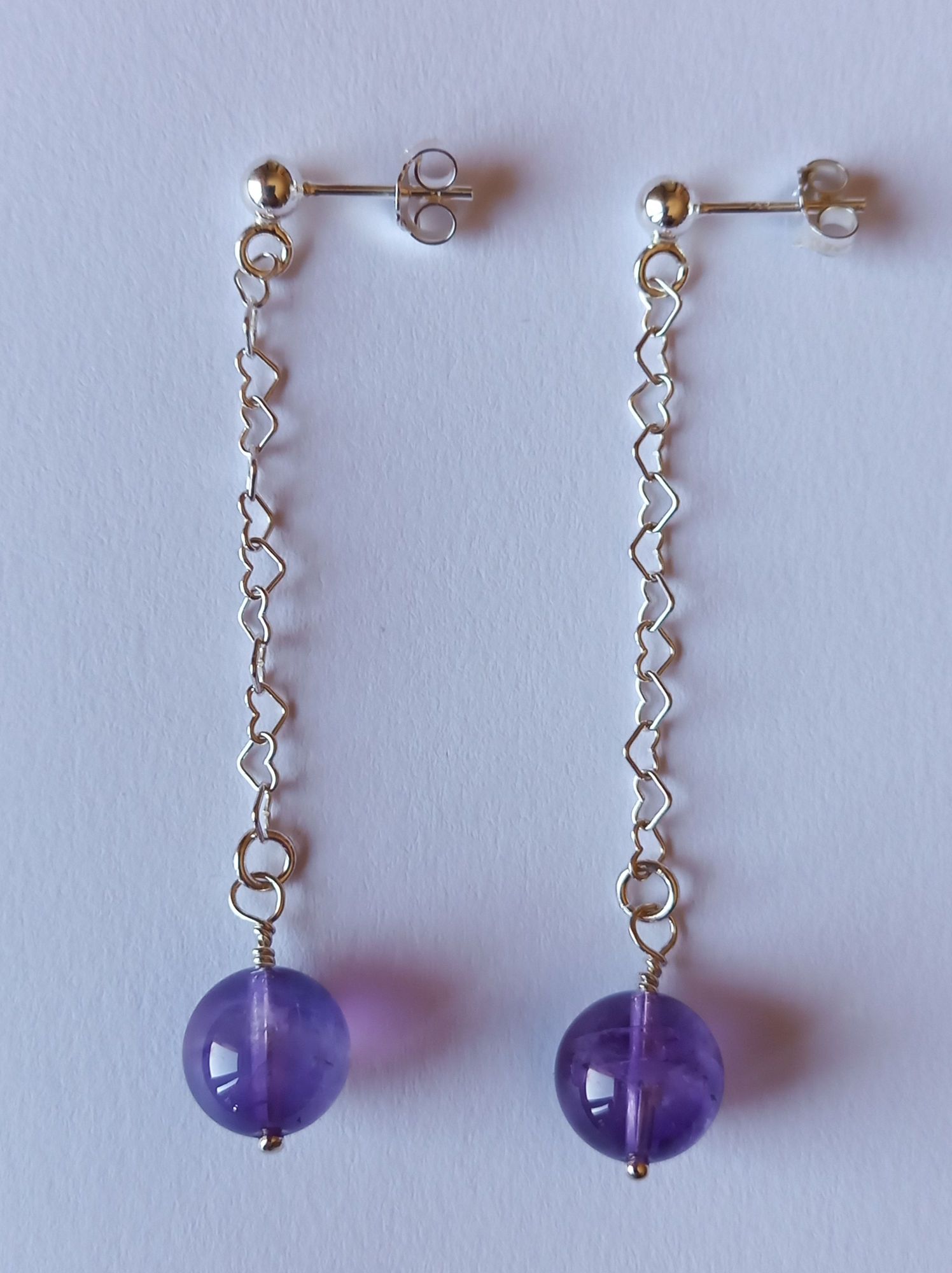 Die Hängeohrringe in Silber tragen violette Amethyst-Perlen, die